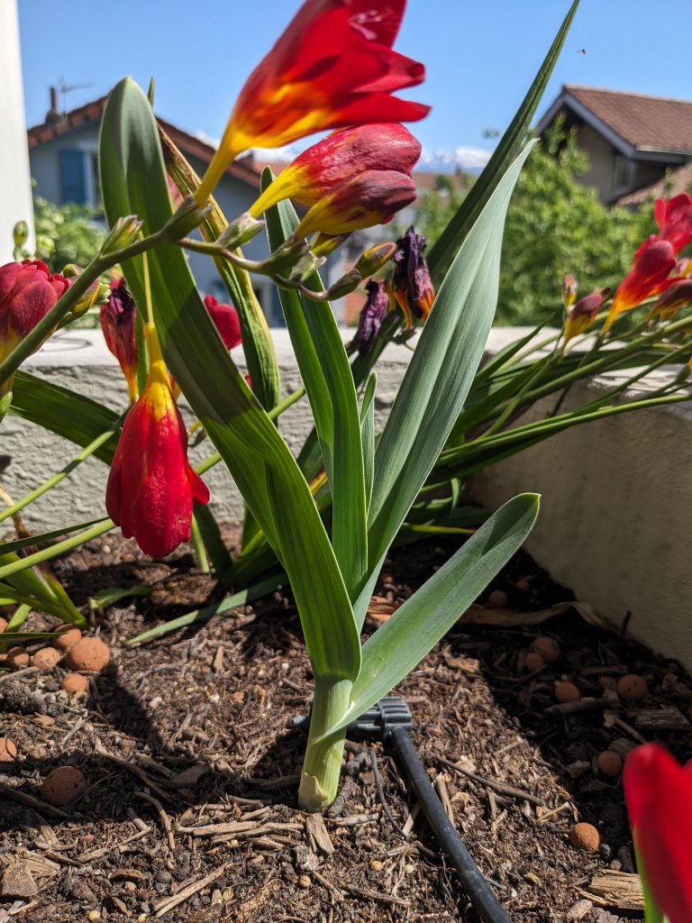 Les freesias sont malheureusement couchés, car il y a eu des rafales récemment.