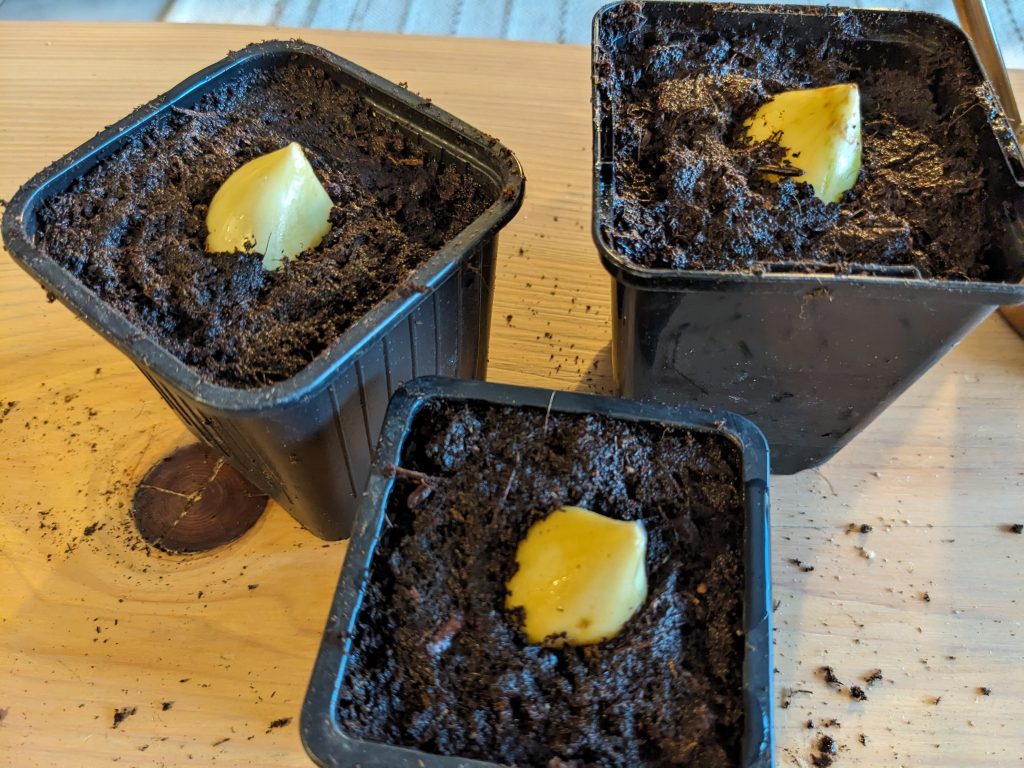D’abord, je les ai débarrassés de leur chemise, car elles n’étaient plus solidaires. Puis, je les ai plantés, germes vers le haut, dans du terreau à semis.