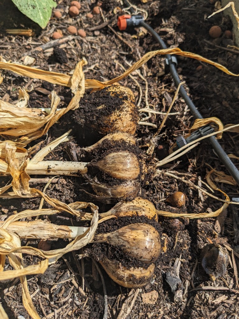 La récolte se fait une fois qu’au moins la moitié des feuilles sont devenues jaunes et sèches. Pour favoriser le développement des têtes d’ail, vous pouvez choisir de couper la fleur de chaque plante lors de son apparition. Mais, à vrai dire, nous ne nous en sommes pas préoccupés, et les bulbes se sont développés sans aucun problème.