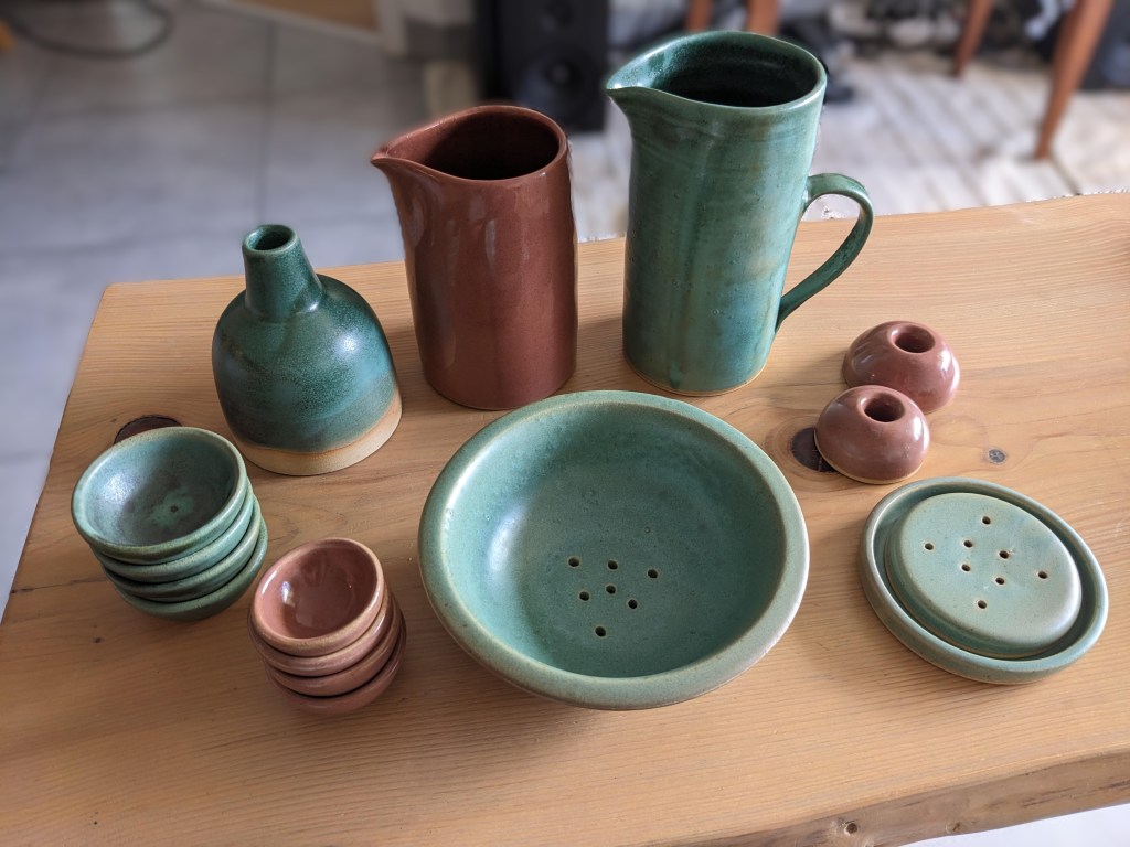 J’ai réalisé 8 séances de 2h30 chacune, soit un total de 20 heures de poterie. Lors de ces séances à l’atelier, j’ai réalisé toutes les étapes de fabrication : tournage, tournassage et émaillage. À titre indicatif, sur ce laps de temps, j’ai réussi à réaliser :