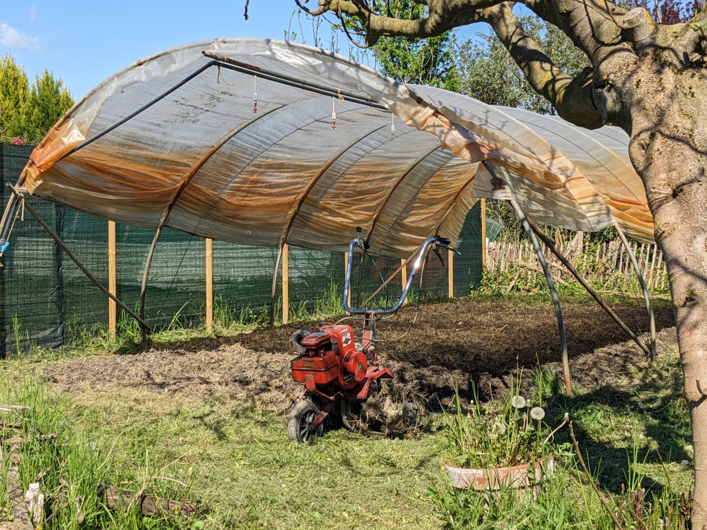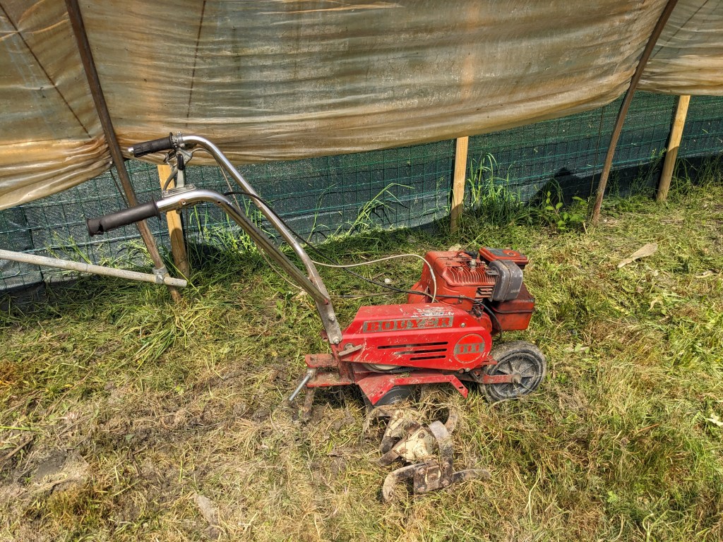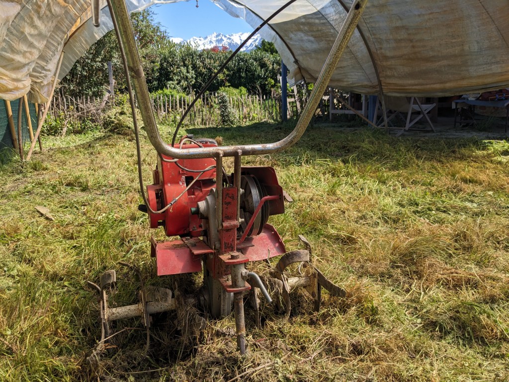 Mais une toile de paillage sur un couvert végétal extrêmement dense et un sol argileux dur comme la pierre, ce n’est pas très utile. C’est pourquoi, le projet de passer le motoculteur s’est imposée.