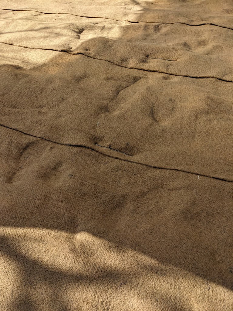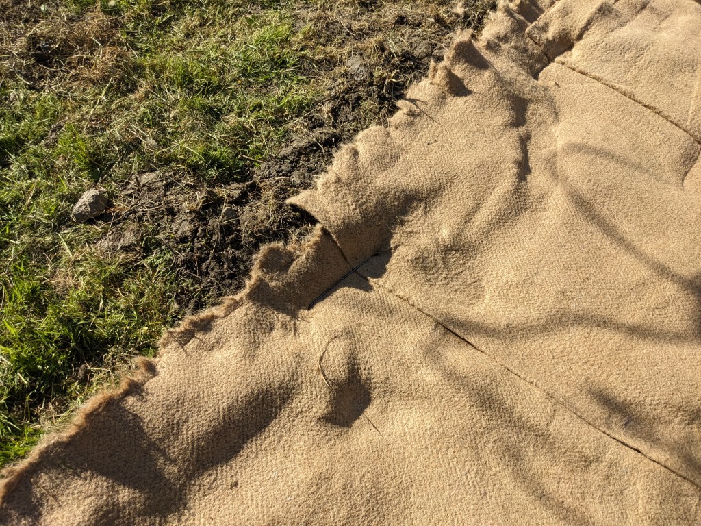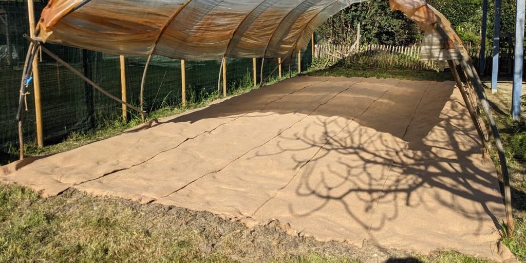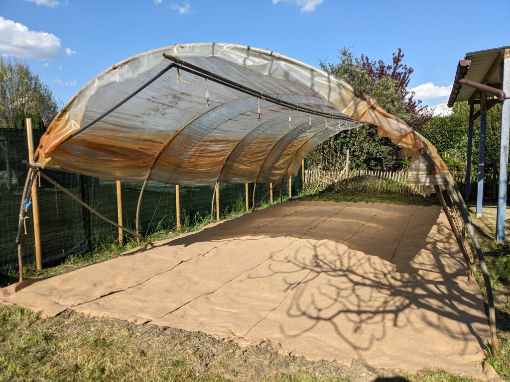 Voici ce que ça donne avec la toile naturelle en jute et sisal 1000 g/m² dans la serre : 5 bandes de 1,10 m de large par 8 m de long, 8 mm d’épaisseur.